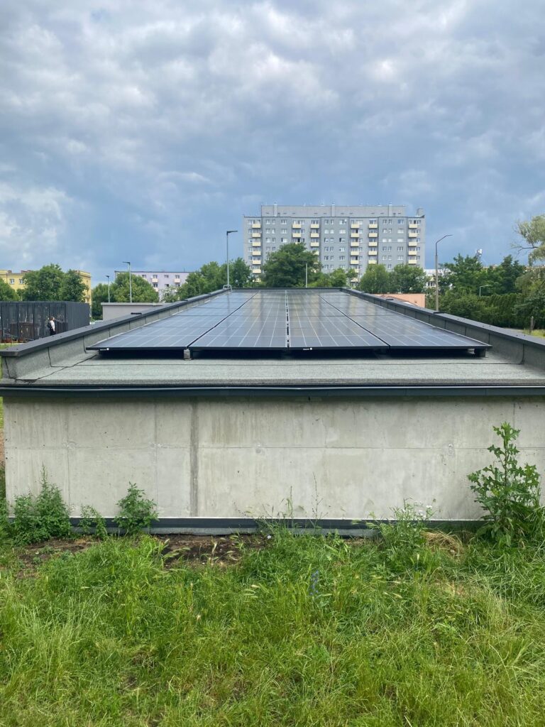 System PV został zaprojektowany z myślą o maksymalnym wykorzystaniu dostępnej przestrzeni – moduły zamontowano zarówno na elewacji budynku, jak i na dachu zjazdu do garażu podziemnego, co pozwoliło na efektywne zagospodarowanie nietypowych powierzchni montażowych.